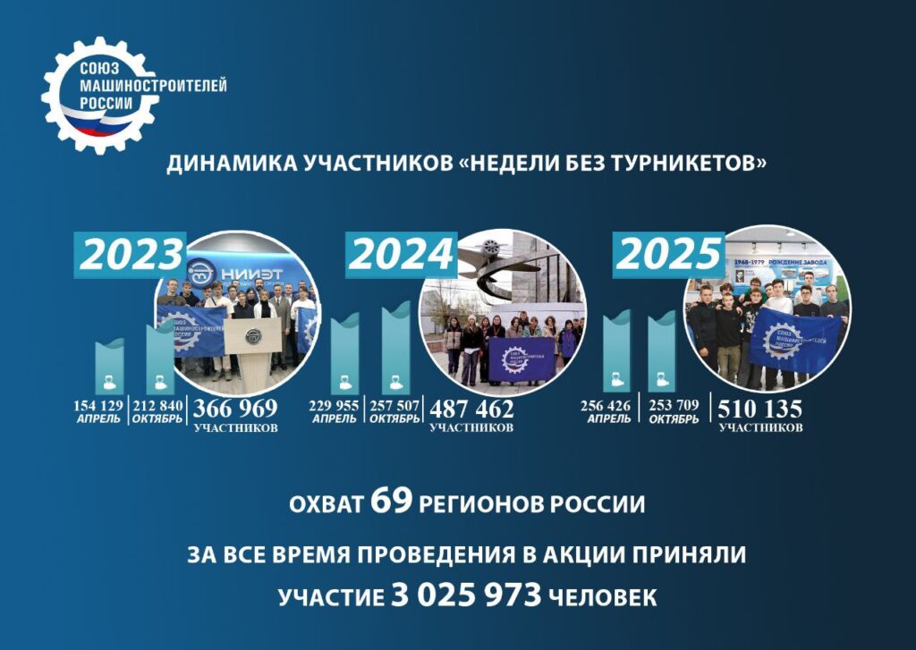 В 2025 году Всероссийская акция «Неделя без турникетов», реализуемая Союзом машиностроителей России при поддержке предприятий и образовательных организаций, отметила своё десятилетие. За это время проект стал одним из главных профориентационных инструментов страны, знакомящим школьников и студентов с современным производством и инженерными профессиями. Акция проводится дважды в год — в апреле и октябре, ее формат позволяет будущим инженерам увидеть реальные производственные процессы, познакомиться с технологиями и попробовать себя в роли специалистов разных направлений.